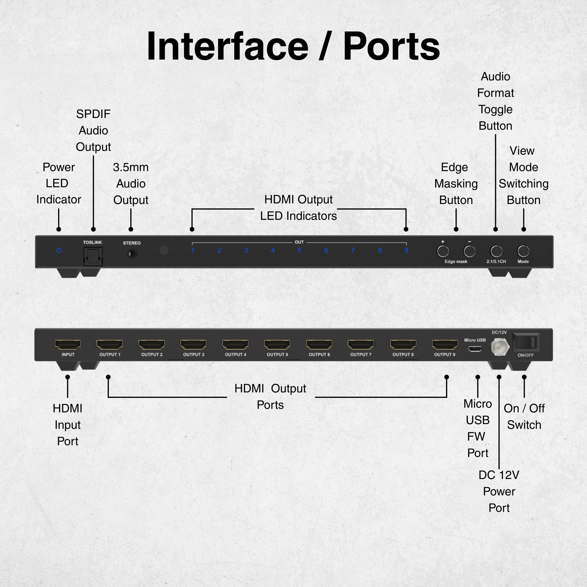 - Audio Extraction Function: Route the audio from your source device to an external sound system via SPDIF Optical (5ch) and 3.5mm (2ch) audio output ports.