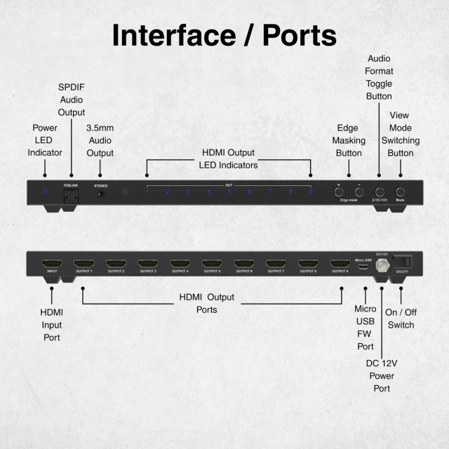 - 8 x HDMI, 1 x 3.5mm, 1 x SPDIF Optical