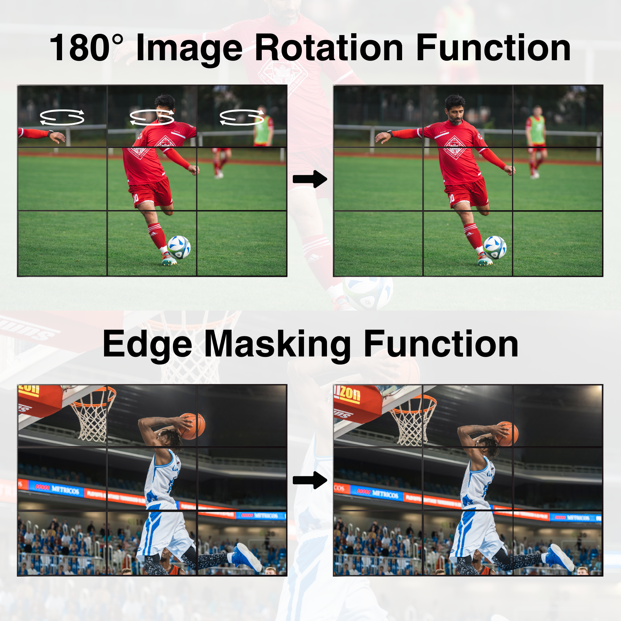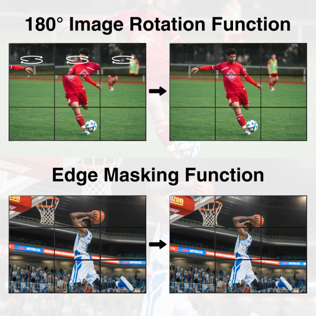 - Image Rotation and Edge Masking Function: Rotate each screen up to 180° (Modes 1–12) for perfect alignment and minimal bezel gaps. Fine-tune the display with edge masking, adjusting up to 8 pixels to eliminate distortion and ensure a seamless video wall.