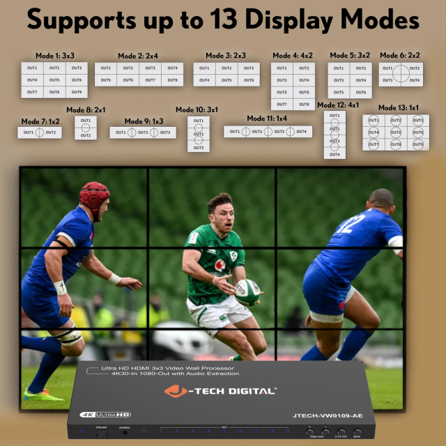 - 13 Display Modes Video Wall Controller: Toggle between 13 different display modes based on your setup, including 3x3, 2x2, 1x1 (Splitter mode), 2x4, 2x3, 4x2, 3x2, 1x2, 2x1, 1x3, 3x1, 1x4, 4x1